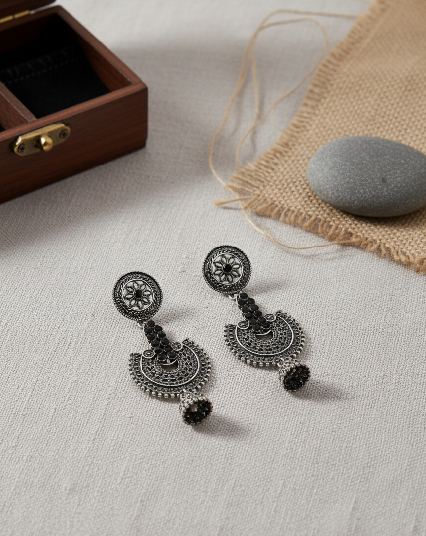 Black Bead Majestic Jhumki | antique silver earrings | traditional jewellery | ethnic earrings for women | lightweight jhumki | oxidised silver jhumki